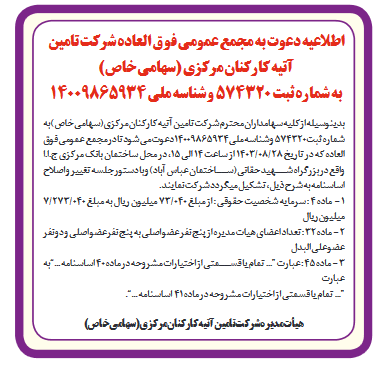 اطلاعیه دعوت به مجمع عمومی فوق العاده شرکت تامین آتیه کارکنان مرکزی(1403/08/21). مشاهده متن خبر